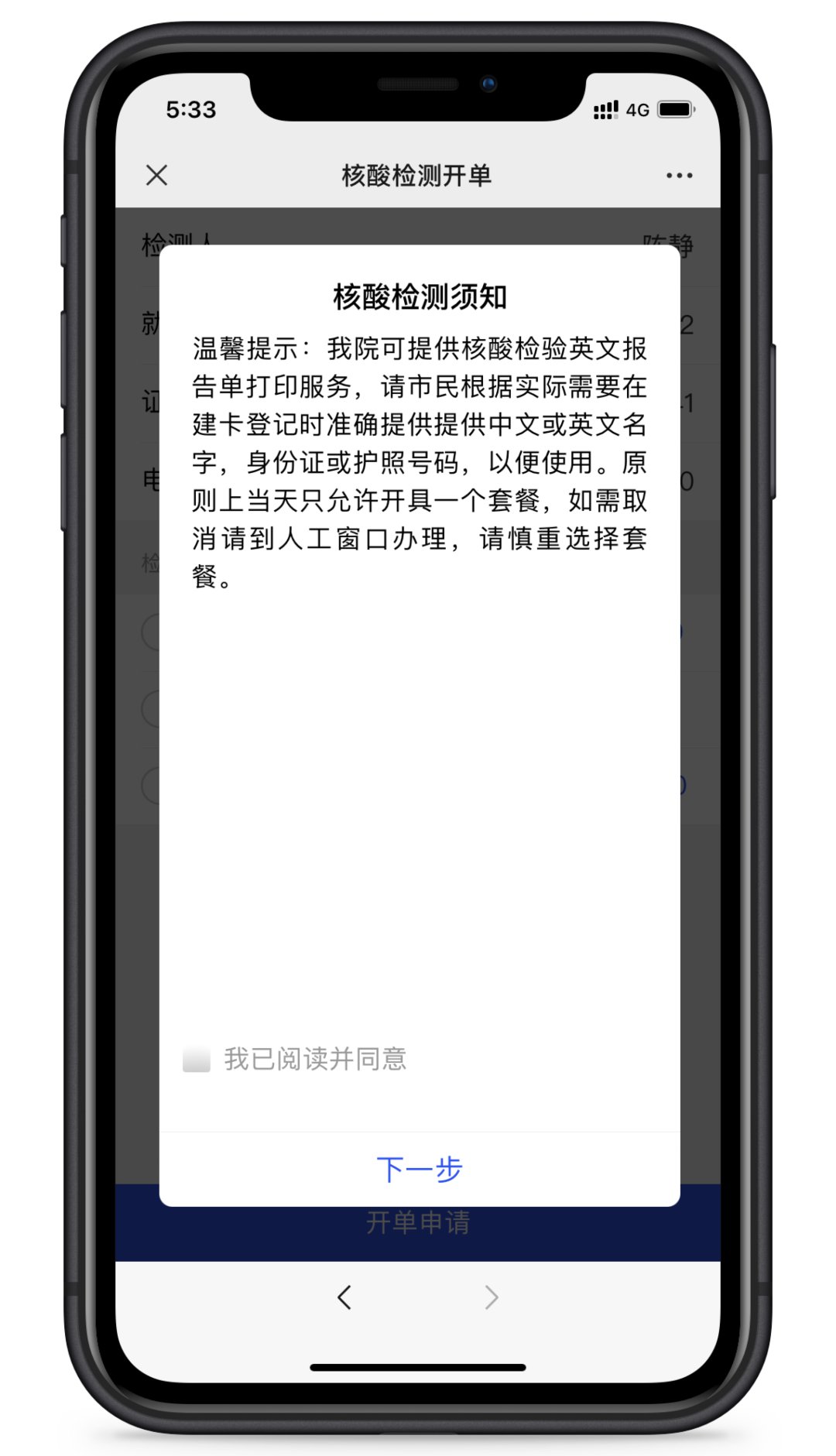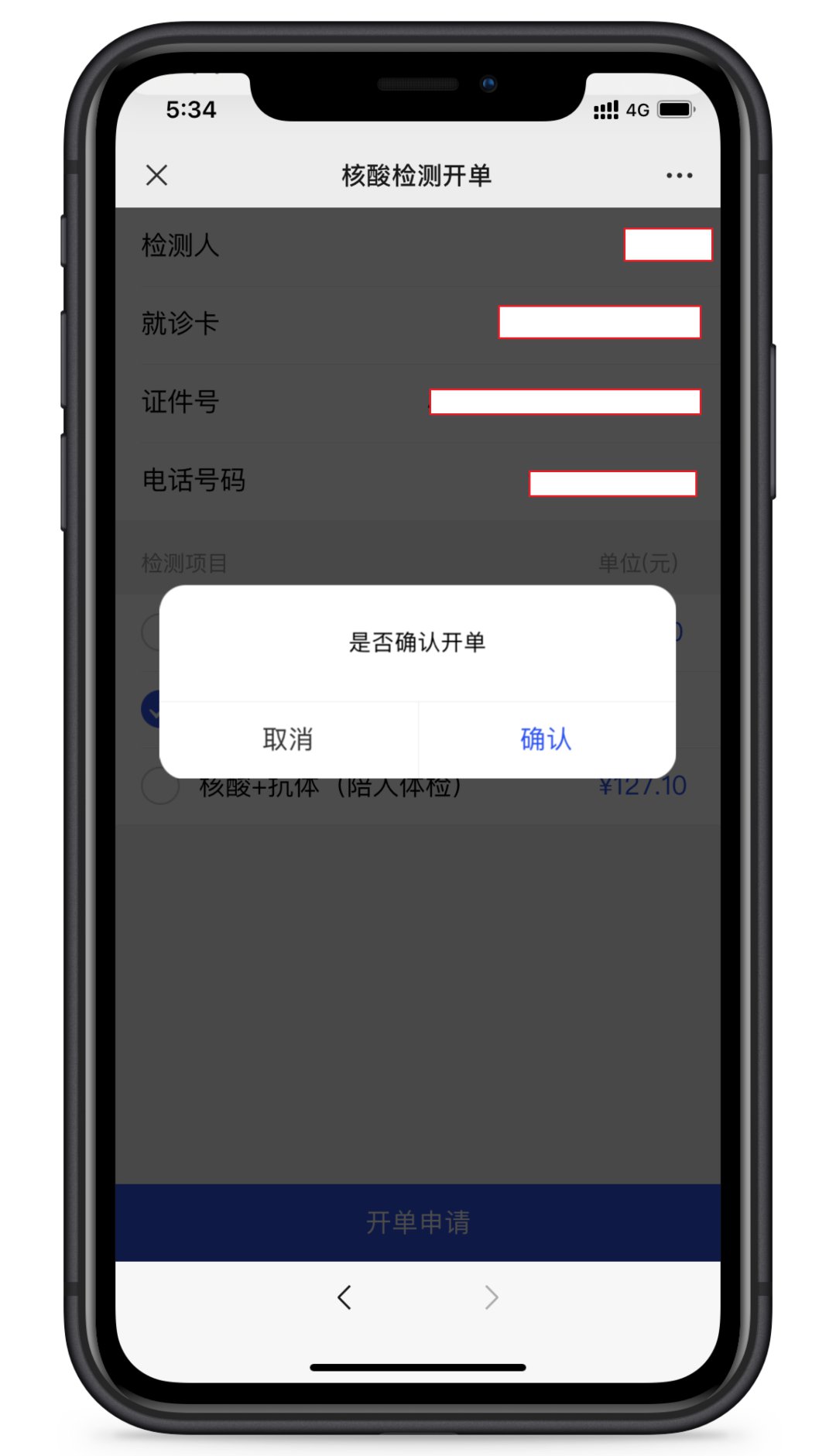 选择对应就诊人后,进入核酸检测开单界面,选择对应检查项目,点击“开单申请”,并点击“确认”。
