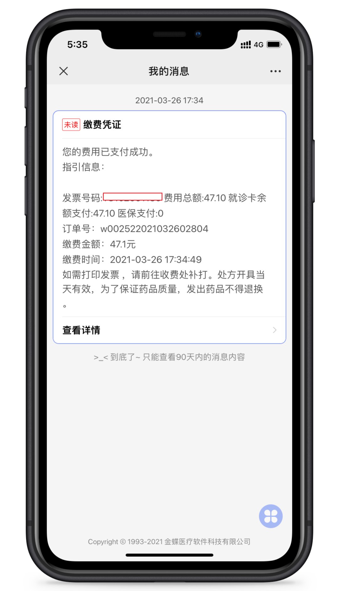 支付成功后,即可生成缴费凭证。点击查看详情,可查看检查项目详情。