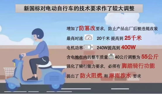 1999年实施的电动自行车标准,缺少防火和阻燃性能、充电器保护等指标,易发生自燃现象,已不符合安全使用的需要。而且,非标电动自行车无防篡改技术,易被“加大电池容量、加装其它装置、改装控制器或电机”等非法改装,造成整车质量过重、电池短路保护不到位等,影响车辆的操纵稳定性和制动性,易引发交通和火灾事故。