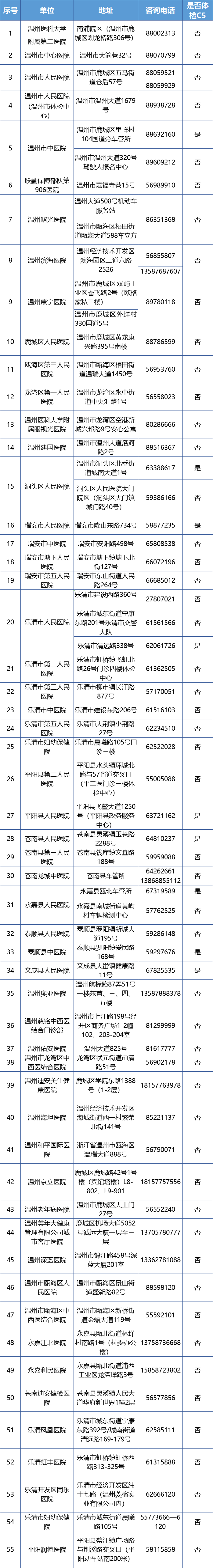 全市机动车驾驶人体检医疗机构名单