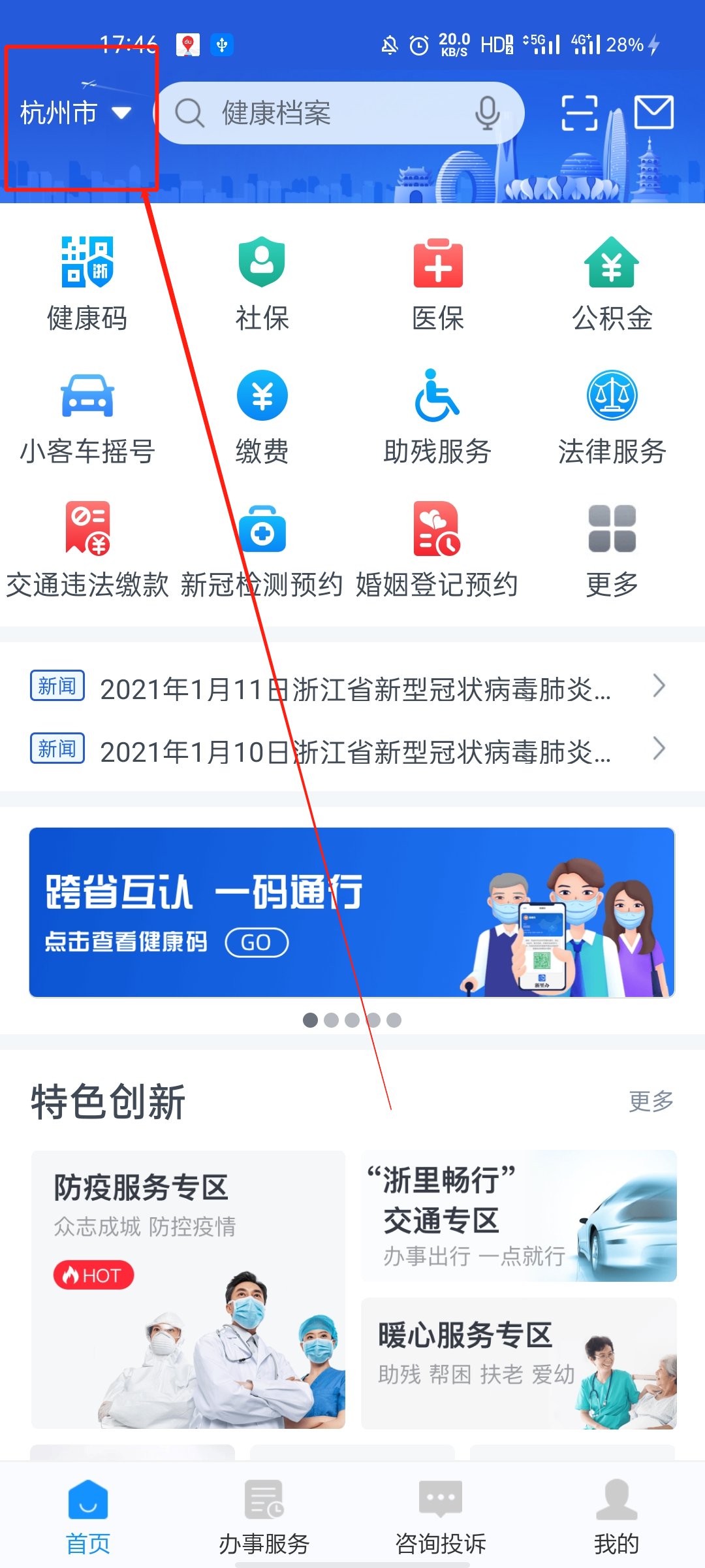 第二步,进入APP后,在页面左上角根据个人需要修改城市;(如下图所示);