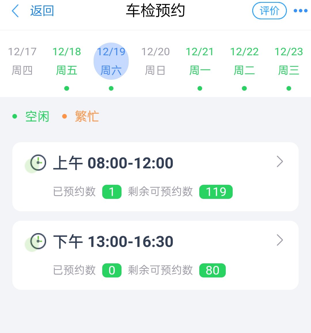 在该步骤,系统会根据上两个步骤的选择计算选定检测站和日期下所有时段的预约情况,预约情况为“空闲”的可以选择,如下图所示。用户根据自己的时间安排,选定时段后,点击【下一步】钮进入步骤6【确认预选信息】。