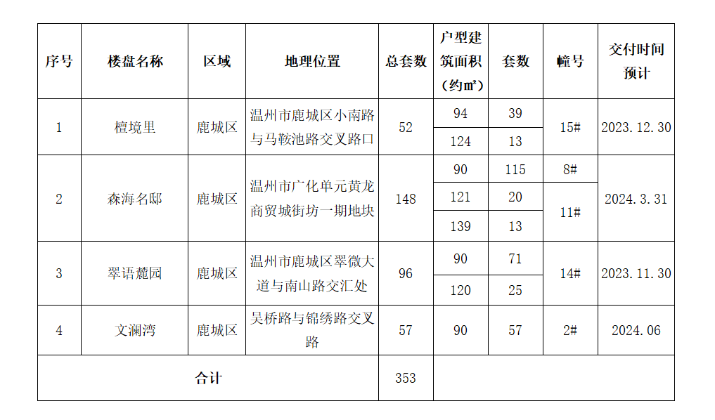 (一)温州市旧城隔岸垟地块(檀境里)人才房位于15号楼,套数52套,5272平方米,其中123平方米档13套,93-94平方米档39套。地块坐落于温州市鹿城区小南路与马鞍池路交叉路口,该项目由温州市光悦房地产开发有限公司开发建设,预计于2023年12月30日交付使用,具体以实际为准。