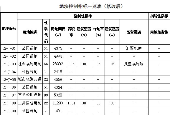 本次规划修改后,12-J-03地块为社会福利用地,用地面积为28392平方米;12-J-05地块为城市轨道交通用地,用地面积为4658平方米;12-J-07地块为其他公用设施用地,用地面积为5028平方米;12-J-08地块为居住用地,用地面积为11230平方米。其他地块用地功能均为公园绿地,用地面积详见地块控制指标一览表(修改后)