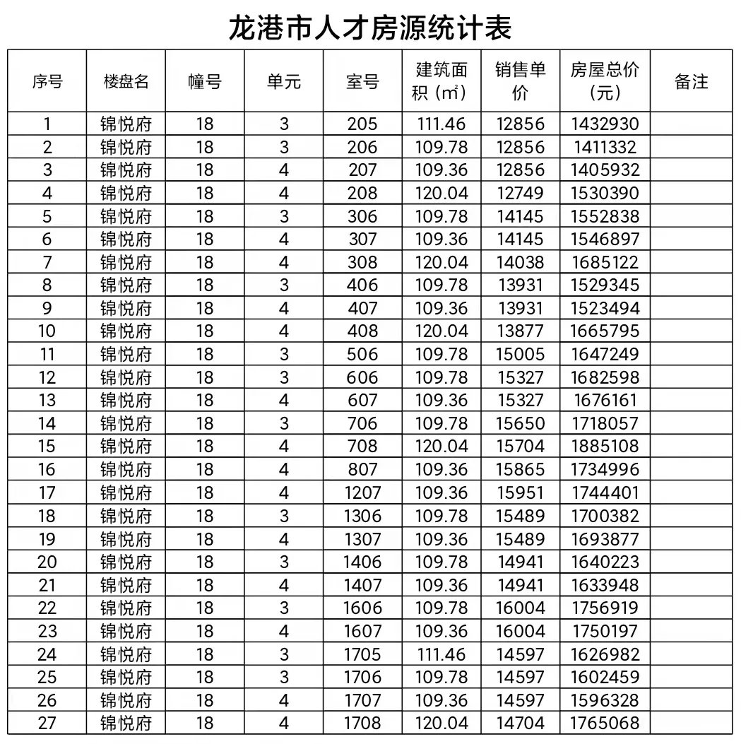 温州龙港市2021年人才住房配售房源明细表