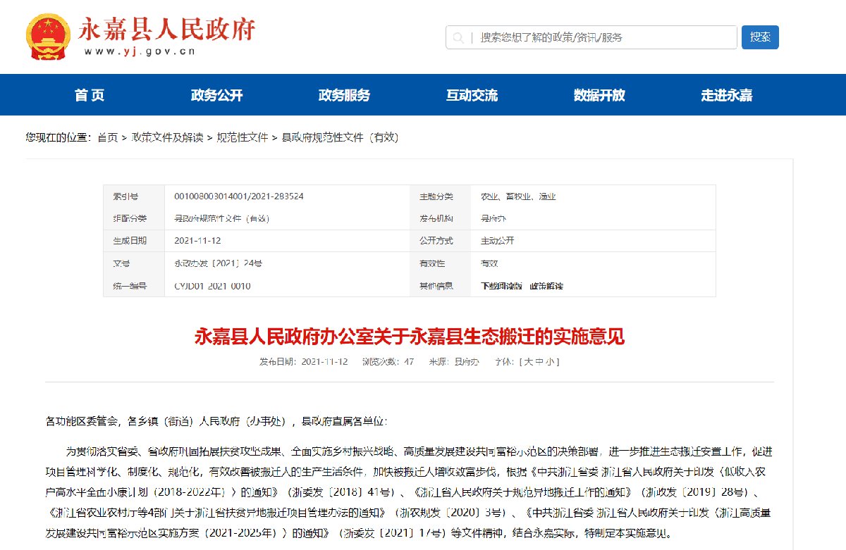 温州永嘉县生态搬迁的实施意见政策原文