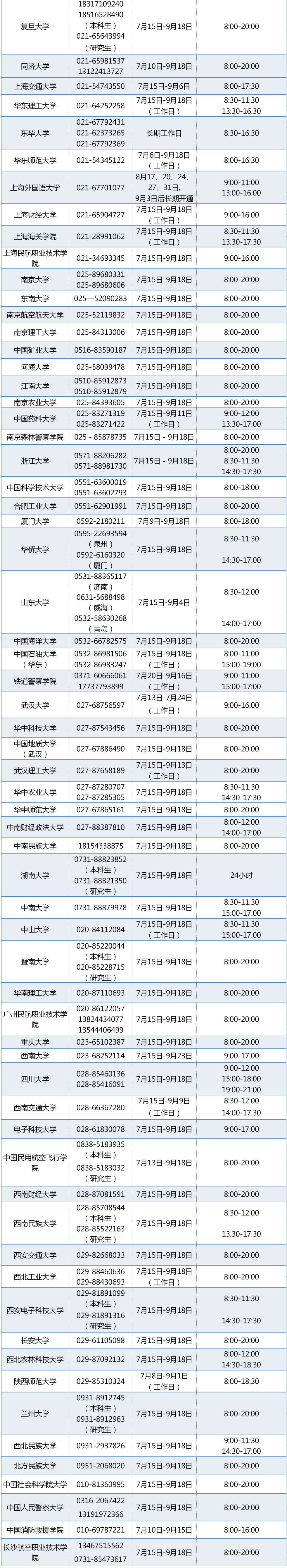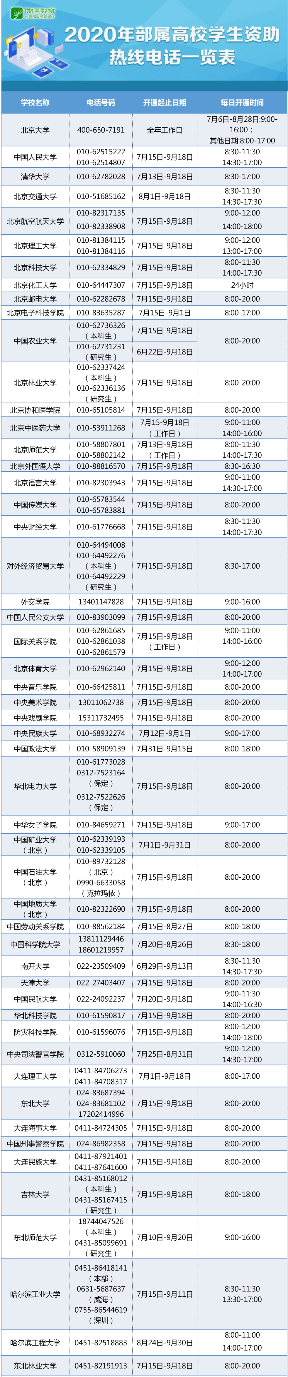 2020年高校学生资助热线电话一览表(学生资助办)