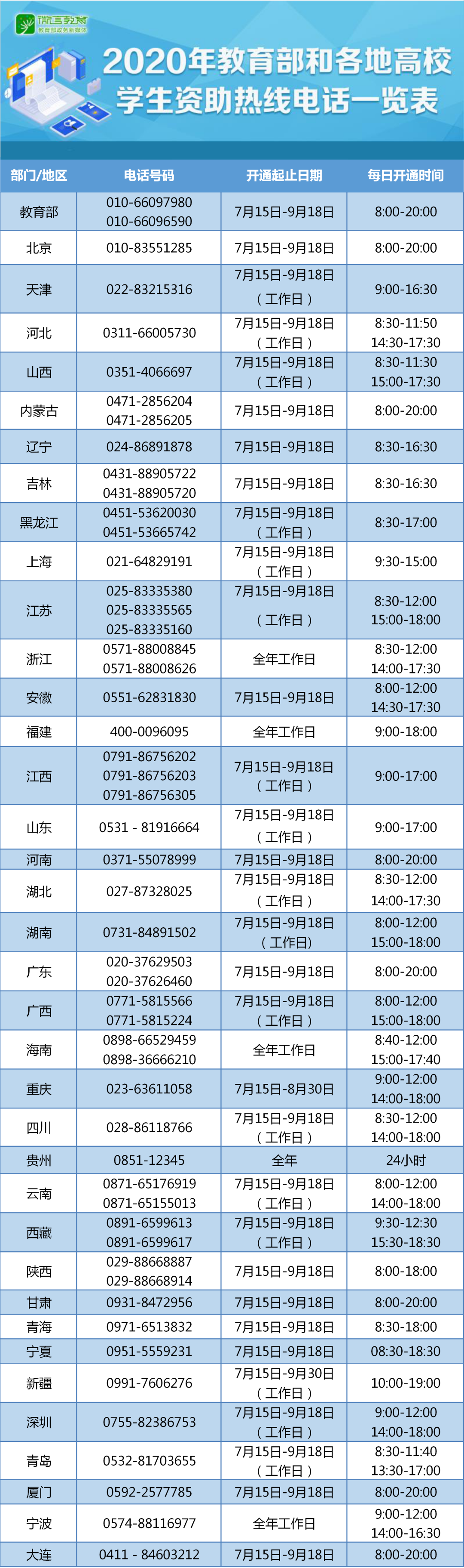 教育部同时要求各省(自治区、直辖市、计划单列市)教育行政部门、各中央高校及地方高校全面开通2020年高校学生资助热线电话。