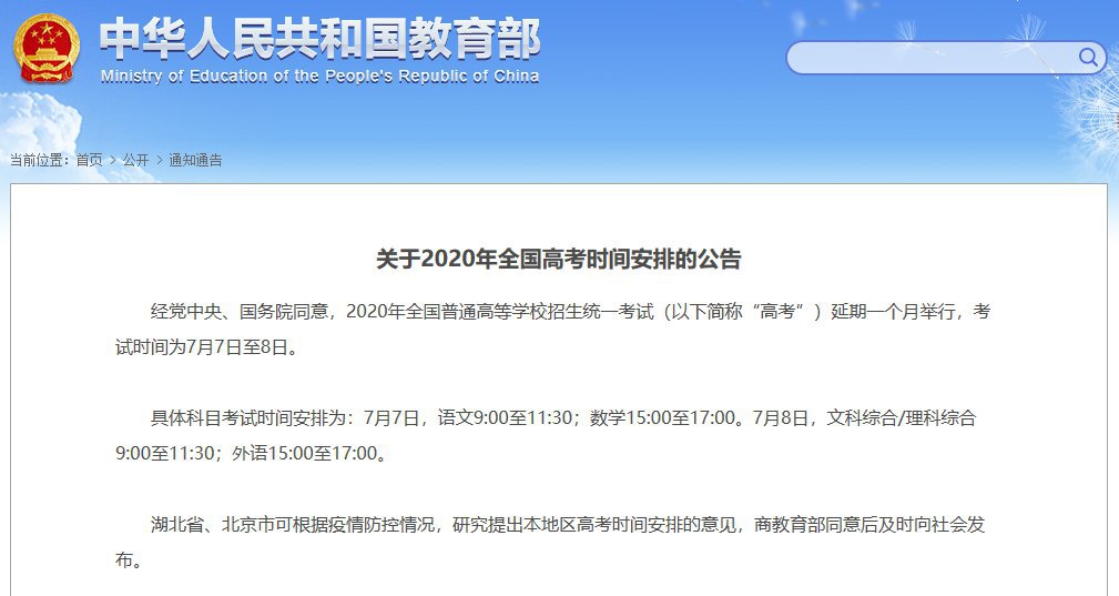 经党中央、国务院同意,2020年全国普通高等学校招生统一考试(以下简称“高考”)延期一个月举行,考试时间为7月7日至8日。