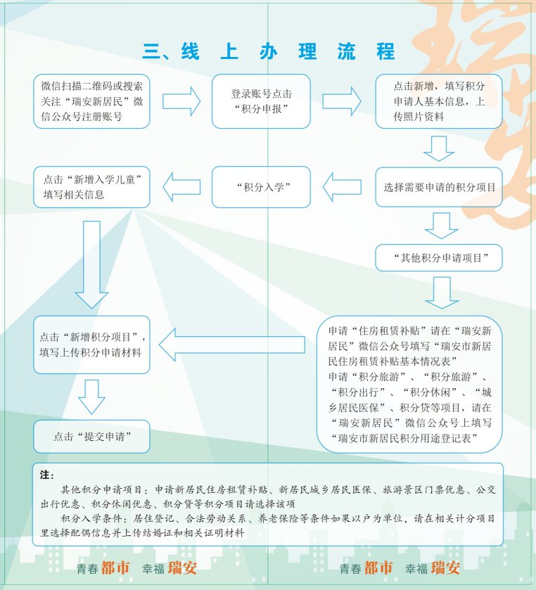 1、今年的积分申请可至居住地所在乡镇(街道)新居民服务机构现场办理;同时新增线上办理方式,新居民可登录“瑞安新居民”微信公众号直接进行网上申请。