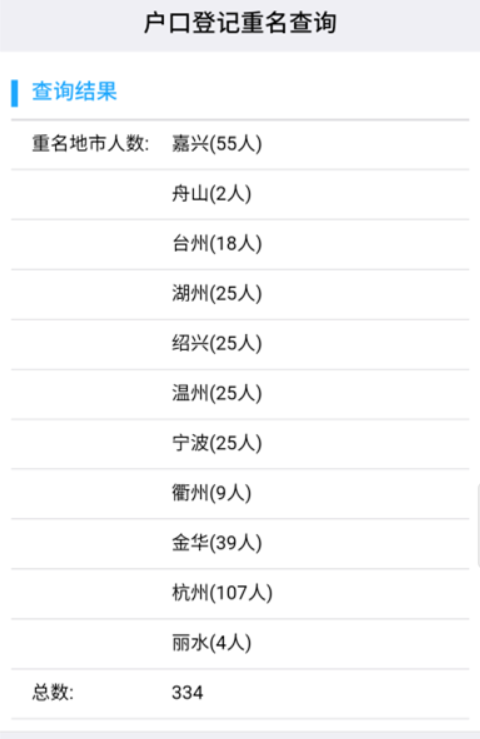 结果显示,浙江省常住人口里面,“郭强”同名的有334个。此外,还能同时查到浙江地级市的重名人数,譬如叫“郭强”的在嘉兴有55人、在舟山有2人、在台州有18人等等。