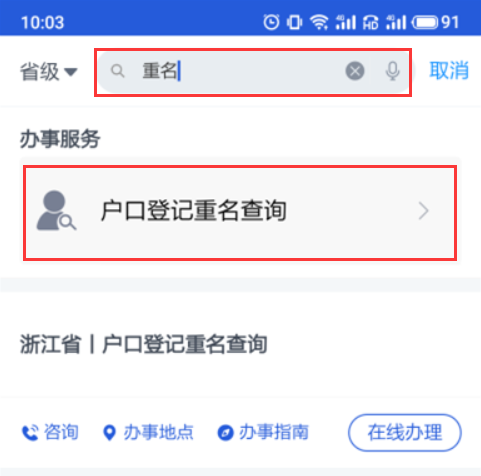 下载安装了“浙里办”APP后,打开“浙里办”,在顶部搜索框搜索“重名”,会出现“户口登记重名查询”服务。