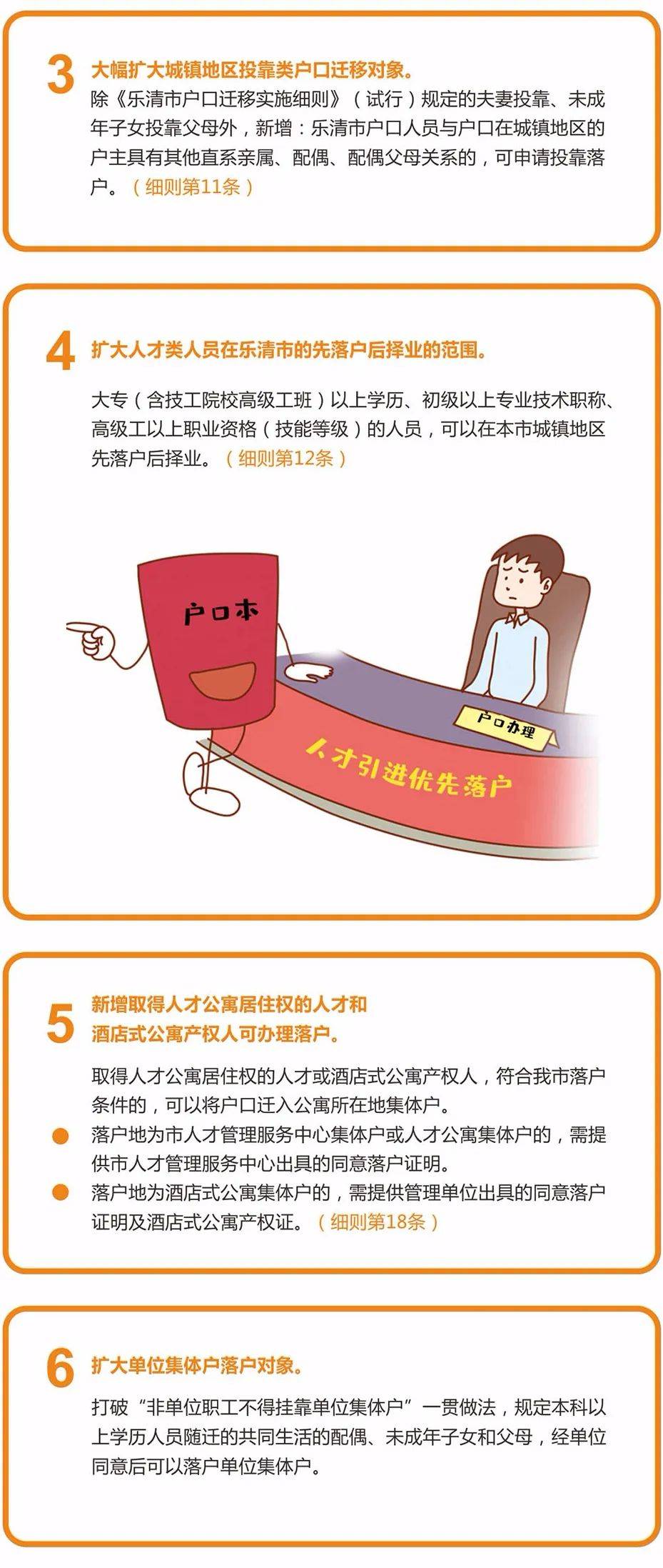 新政策中,收紧农村地区户口迁入条件;大幅放宽城镇地区居住就业落户条件;大幅扩大城镇地区投靠类户口迁移对象;扩大人才类人员在乐清市的先落户后择业的范围;新增取得人才公寓居住权的人才和酒店式公寓产权人可办理落户;扩大了单位集体户落户对象。