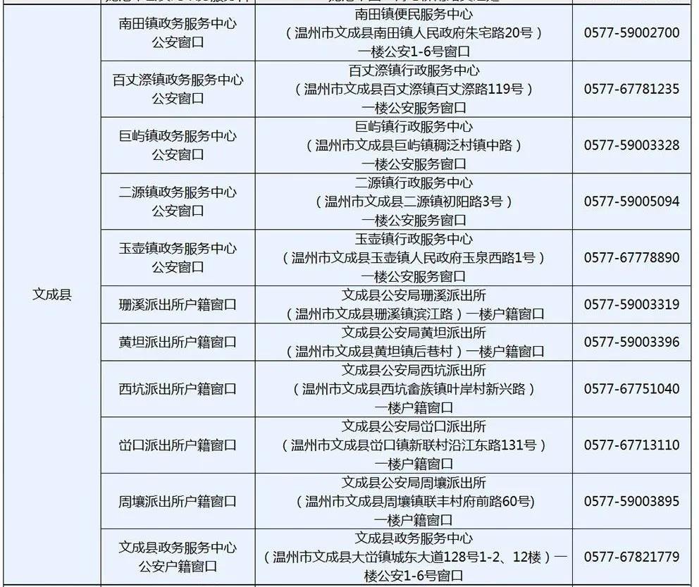 文成县户籍窗口一览表