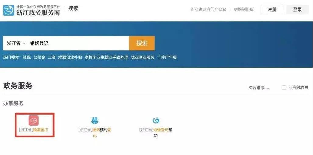 1、登录浙江政务服务网(点击进入预约),首页搜索“婚姻登记”