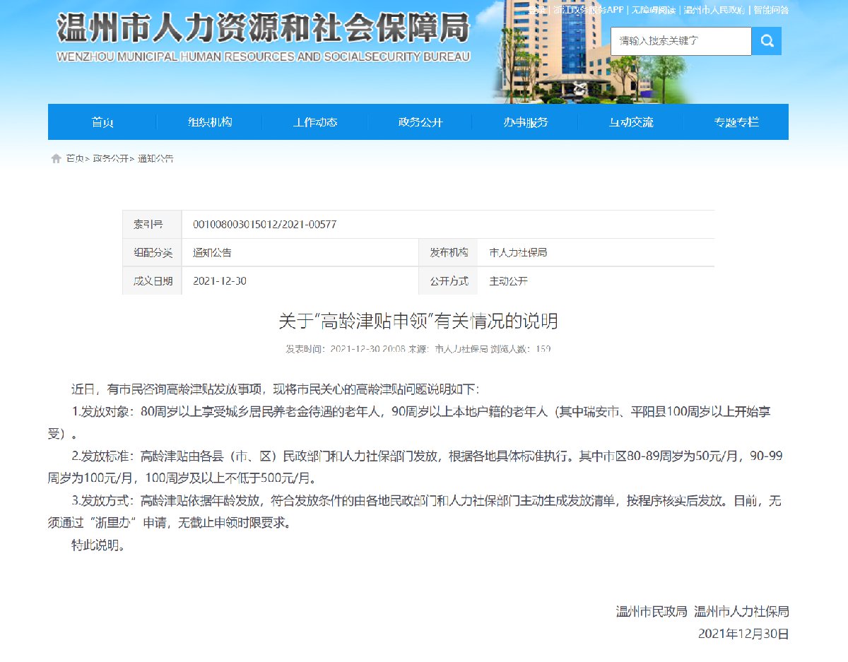 温州老年人高龄津贴发放对象+发放标准+发放方式