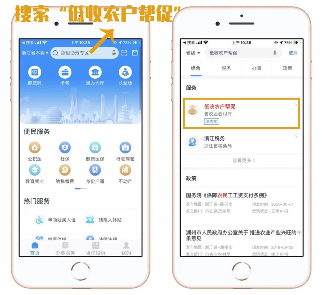 在页面顶部搜索栏输入“低收农户帮促”即可进入服务。