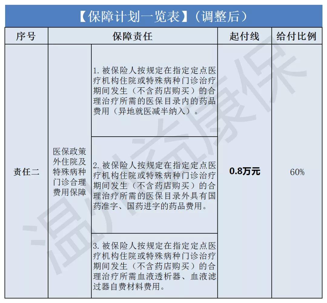 责任二优化调整为“被保险人按规定在指定定点医疗机构住院或特殊病种门诊治疗期间发生(不含药店购买)的合理治疗所需的医保目录内超限定范围的药品费用和医保目录外的药品费用、血液透析器、血液滤过器,按全额纳入合规费用进行赔付(注:异地就医合规费用先减半后纳入),起付线由2万元下降至0.8万,给付比例为60%:
