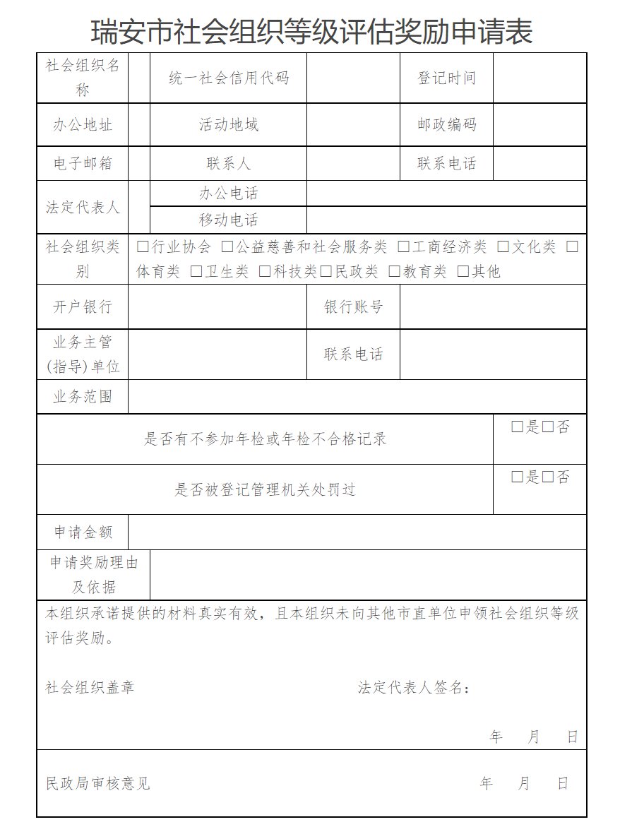 第九条 申报单位须提交《瑞安市社会组织等级评估奖励申请表》一式两份报市民政局审核批准。
