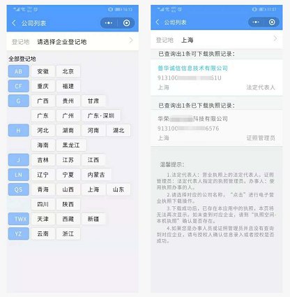 2.通过实名认证后,选择企业所在的登记地,显示该登记地的所有可下载和已下载的执照记录,在“可下载执照记录”中选择企业名称,下载该企业的电子营业执照。