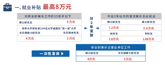 对新全职来乐工作的35周岁以下博士研究生、世界大学排名前200位大学(以最新一期ARWU、THE、QS、U.S.News排名为准)或国内“一流大学”“一流学科”全日制硕士研究生、本科生,分别给予总额6万元、4万元、3万元就业补贴,分2年发放。