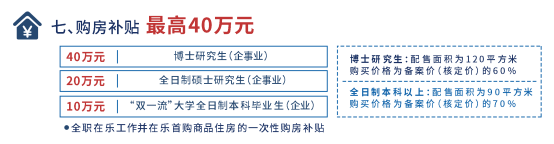 向全职在乐企事业单位工作并首次购买商品住房的博士研究生、全日制硕士研究生分别发放一次性购房补贴40万元、20万元。向全职在乐企业工作并在乐首购商品住房的“双一流”大学全日制本科毕业生发放10万元一次性购房补贴。向符合条件的博士研究生、全日制本科以上学历人才配售人才住房,配售面积分别为120平方米、90平方米,购买价格分别为备案价(核定价)的60%、70%。