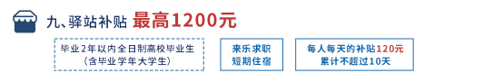 通过政府购买服务形式鼓励社会机构为毕业 2 年以内全日制高校毕业生(含毕业学年大学生)来乐求职提供短期住宿服务,攻坚期间每人每天的标准为120元,累计不超过10天。