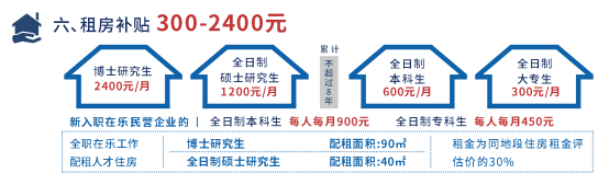 向全职来乐企事业单位工作的博士研究生、全日制硕士研究生发放租房补贴,分别为每月2400元、1200元,累计补贴不超过8年。向全职来乐企业或高校、科研院所工作的全日制本科生、全日制大专生发放租房补贴,分别为每月600元、300元,补贴时间累计不超过8年。