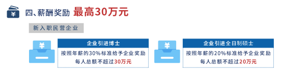 鼓励企业全职引进高校毕业生,新入职民营企业的,按照博士研究生、全日制硕士研究生年薪的30%、20%标准给予企业薪酬奖励,每人总额不超过30万元、20万元。