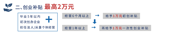 在攻坚期间,毕业5年以内的高校毕业生初次来乐创办企业并担任法定代表人或从事个体经营,依法缴纳社会保险费6个月以上的,给予个人1万元初创补贴;正常经营1年以上且连续缴纳社会保险费的,再给予个人1万元的一次性创业补贴。