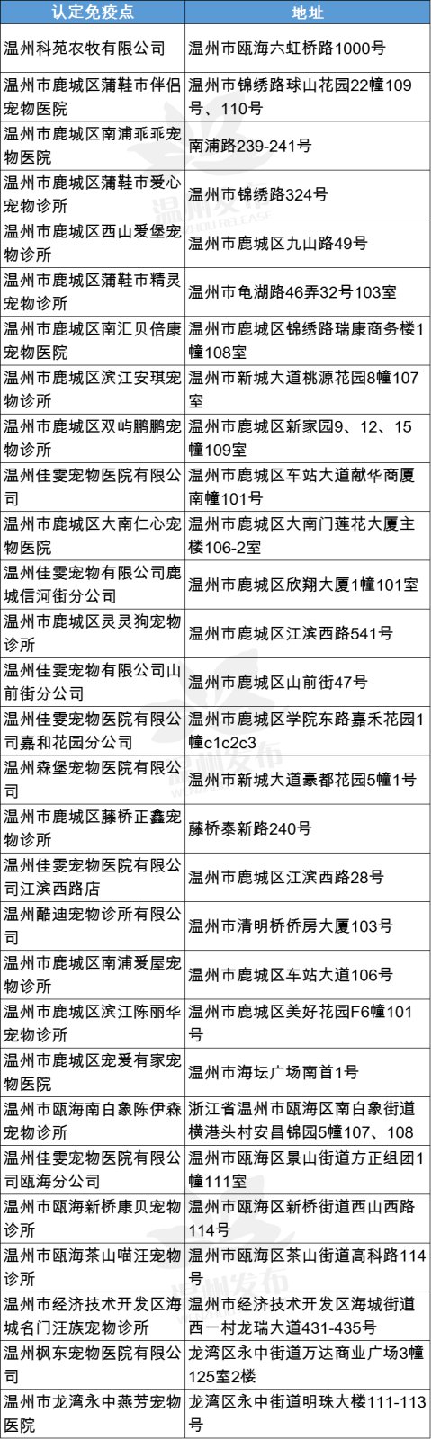 温州市犬只狂犬病认定免疫点地址一览