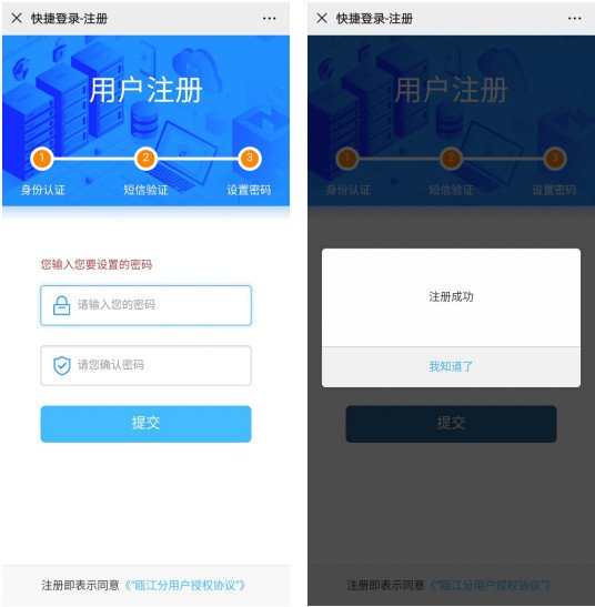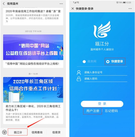 1、关注进入“信用温州”官方微信公众号,点击下方【瓯江分】菜单,选择【快捷登录】,新用户点击下方【用户注册】按钮。