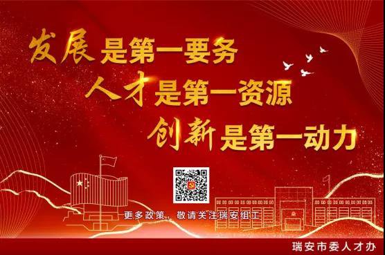 瑞安市委市政府大力实施“人才强市”战略,先后出台《人才新政40条》、《大学生新政10条》、《人才安居办法》等政策,着力构建更加积极、更加开放、更加有效的人才政策体系。