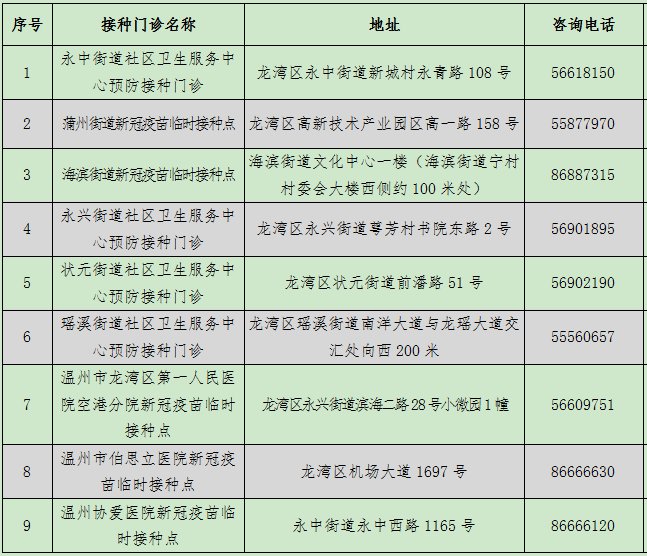 龙湾区新冠疫苗接种门诊一览表