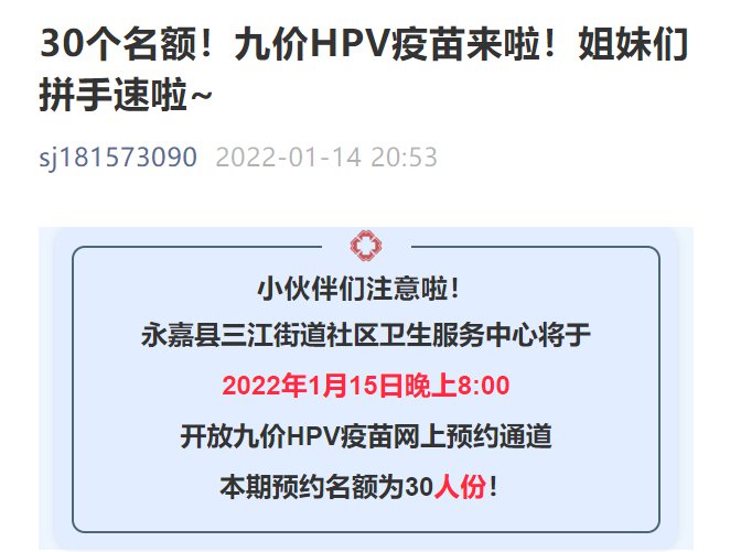 温州永嘉县三江街道社区卫生服务中心将于2022年1月15日晚上8:00,开放九价HPV疫苗网上预约通道!本期预约名额为30人份!