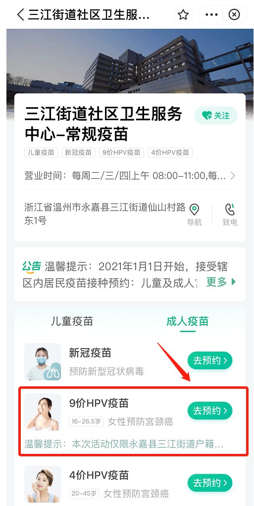 永嘉县三江街道社区卫生服务中心将于2021年9月19日晚上8:00,开放九价HPV疫苗网上预约通道!本期预约名额为九价50人份!