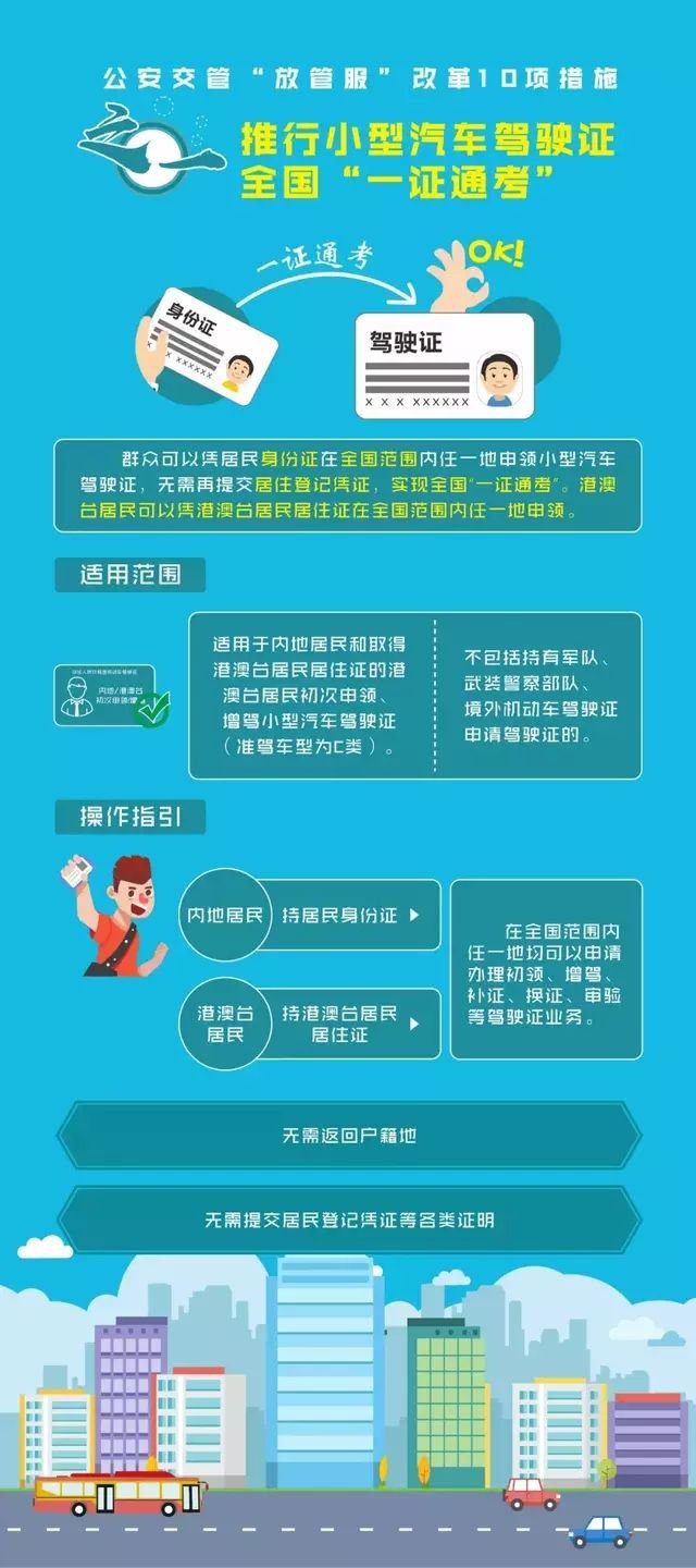 自2019年6月1日起,公安交管“放管服”改革十项措施,推行小型汽车驾驶证全国“一证通考”。