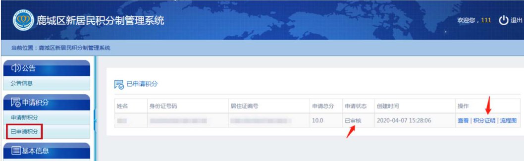 13.积分受理审核完成后,中心将向申请人发送短信通知,请注意查收,申请人在收到短信通知后,请参照指南第1点(即第一次申请积分管理)步骤,登入浙江省政务服务网→“鹿城区新居民积分制管理系统”,点击左侧菜单栏的“已申请积分”,查看“积分证明”。