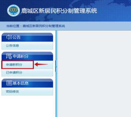 6.在“鹿城区新居民积分制管理系统”页面中,点击左侧菜单栏“申请新积分”。