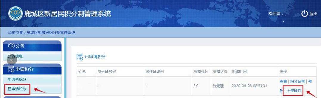 10. 在“积分管理申请情况”项目中,根据积分项目选择自身情况对应分值,填写各项目“自评分”后,点击确认提交,之后,将出现“证件上传”页面,请根据提示,上传对应积分项目的证件照片,上传完毕后,点击完成上传,上传是否成功,请查看右侧“证件状态”,请注意,上传证件图片文件格式须为jpg格式, 每个文件最大为400KB。