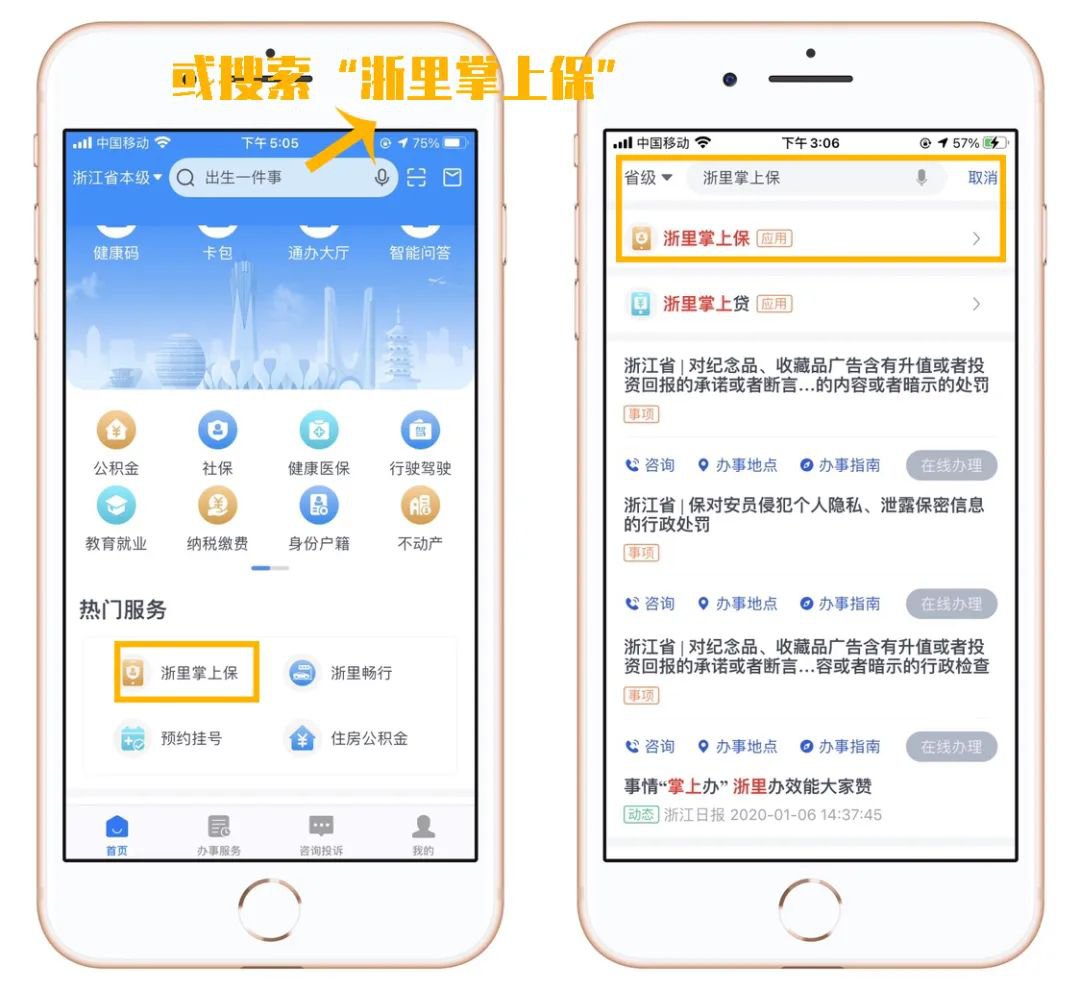 进入省本级站点,点击“浙里掌上保”,或搜索关键词,进入服务;