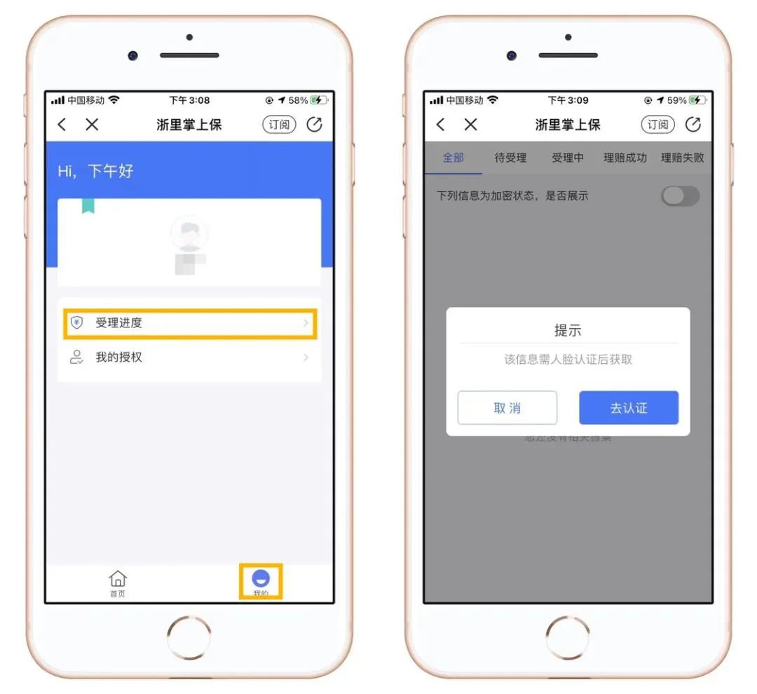 点击“我的”,可查看受理进度。哪些理赔待受理,哪些理赔已成功,相关状态一目了然。