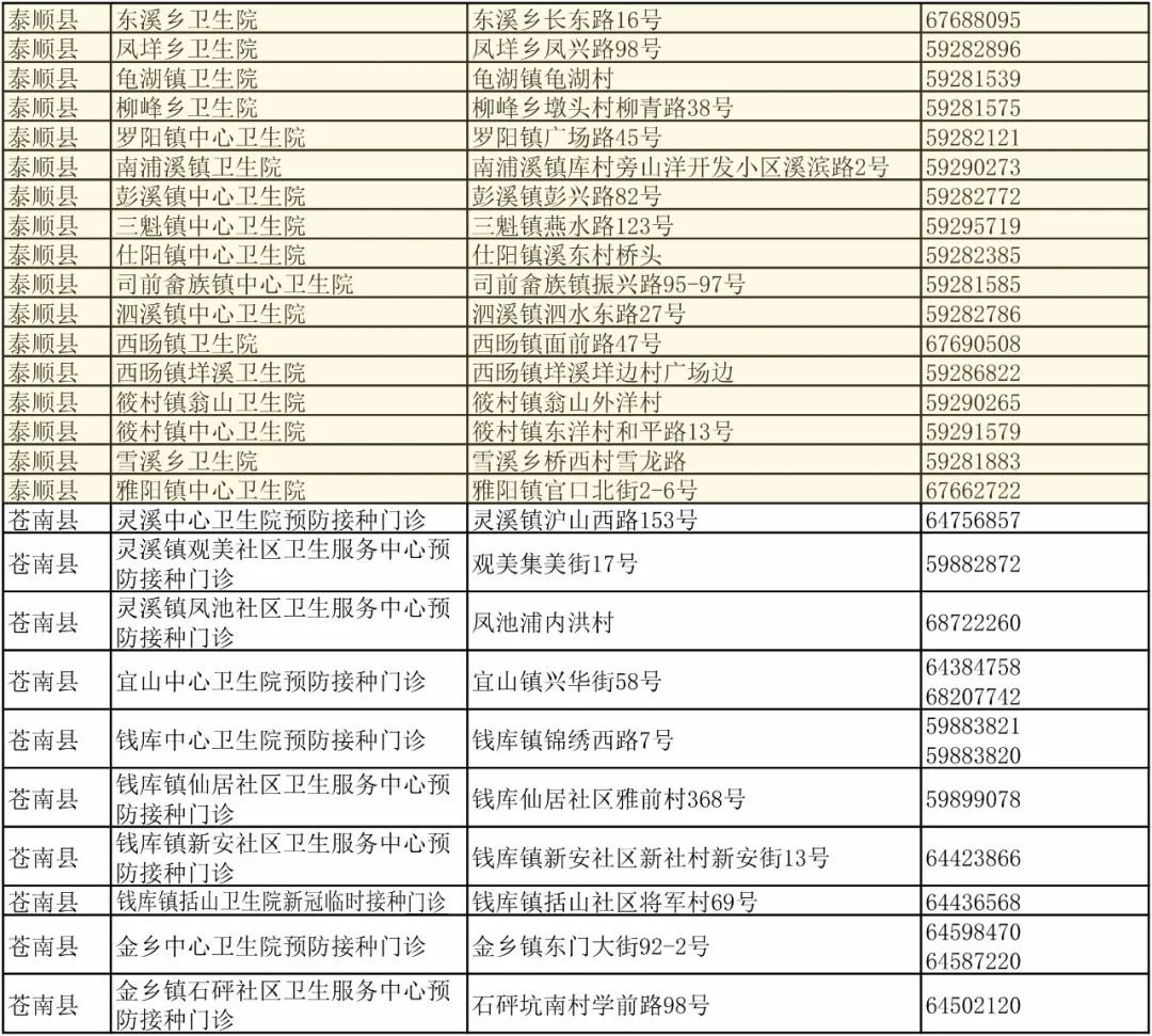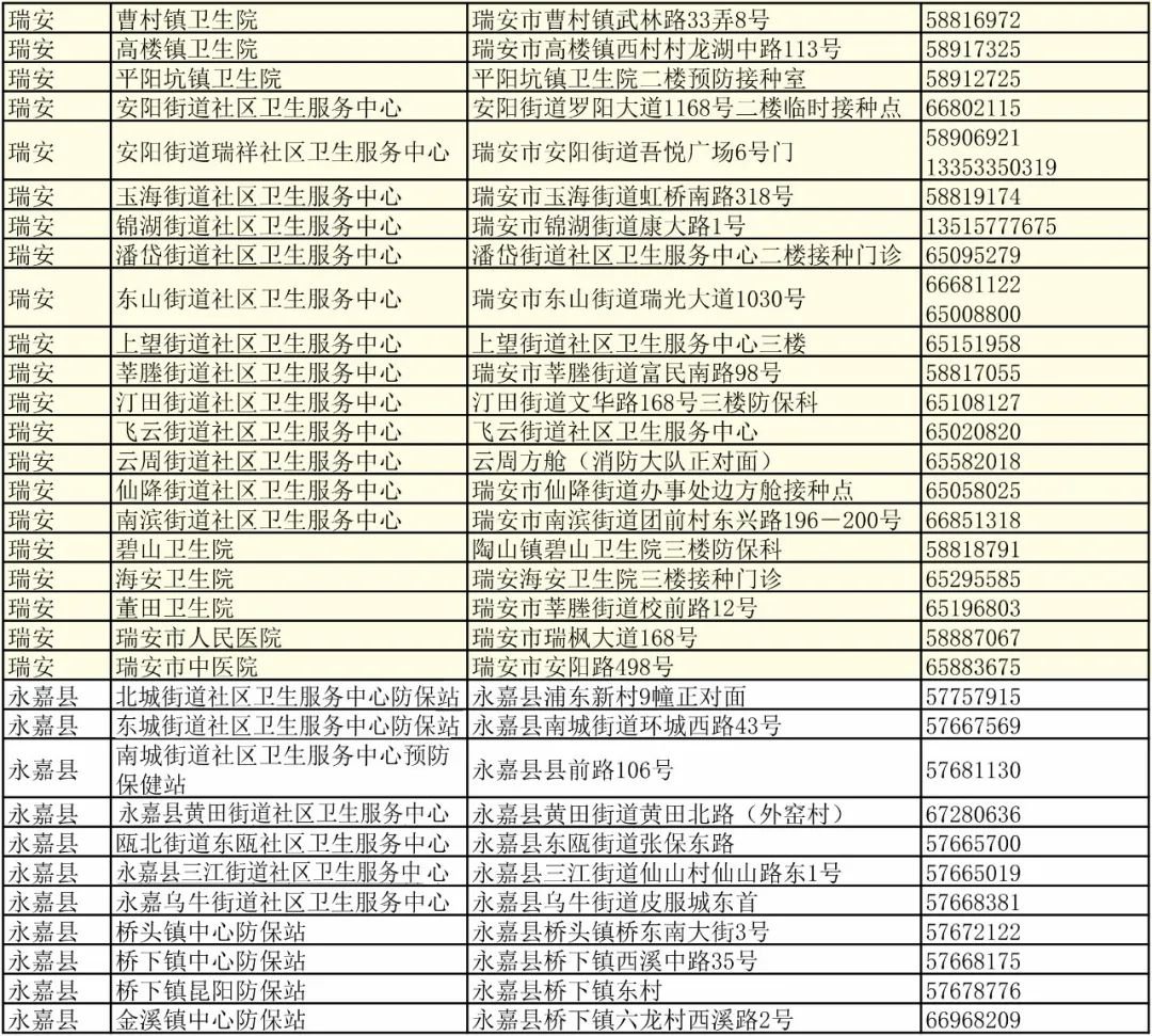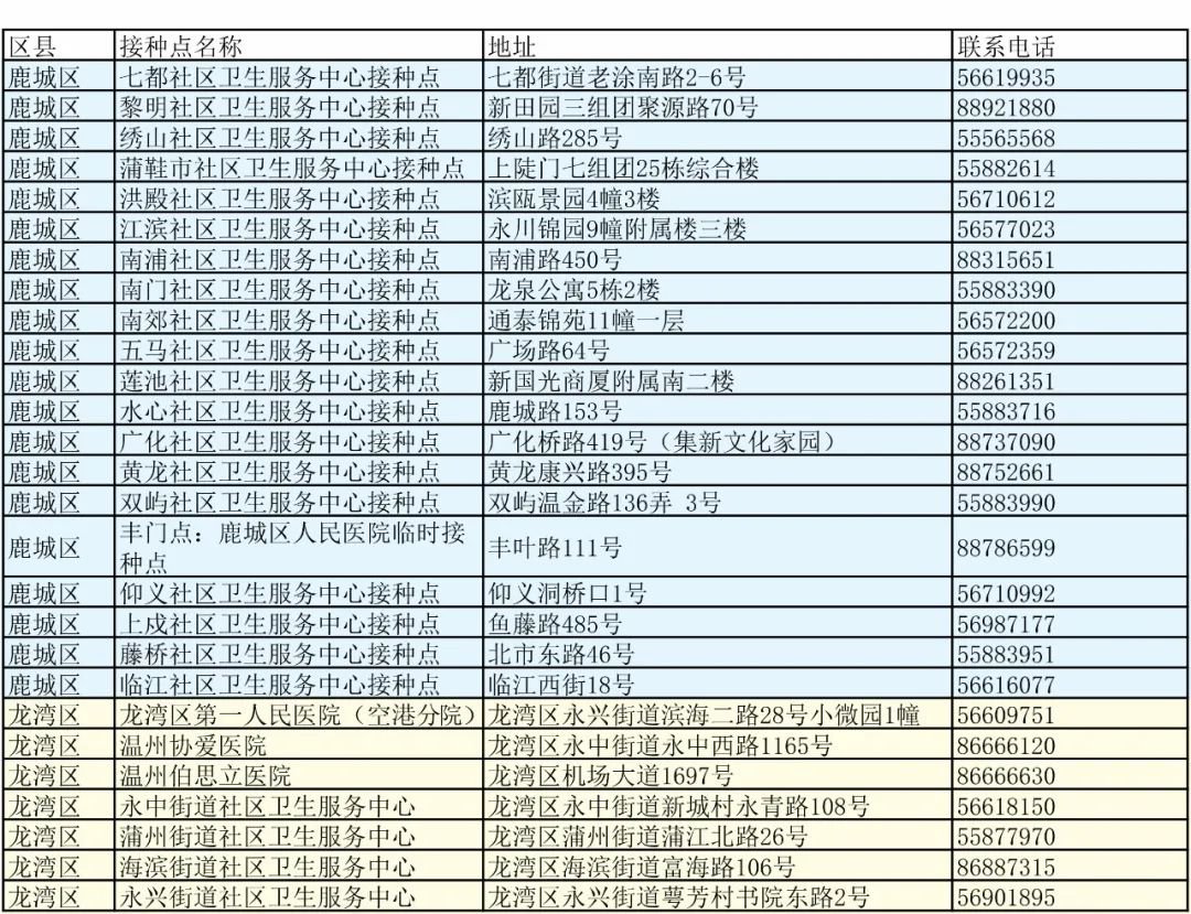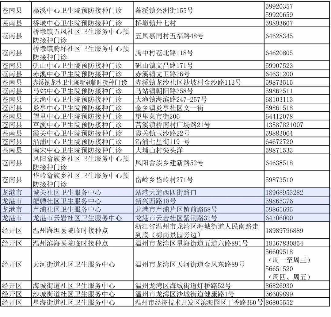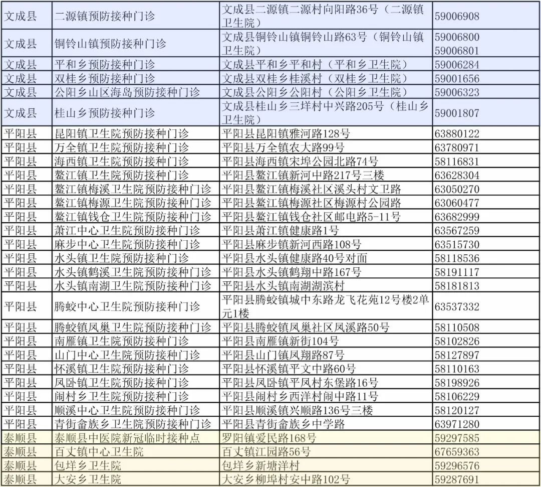 温州市各县(市、区)新冠疫苗接种门诊