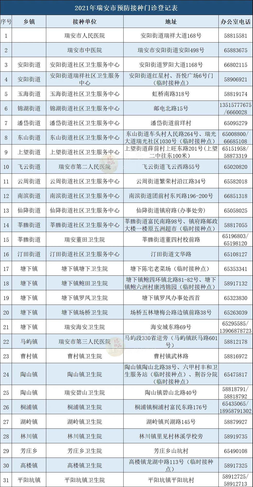 下表为瑞安市31个疫苗接种单位全名单