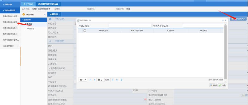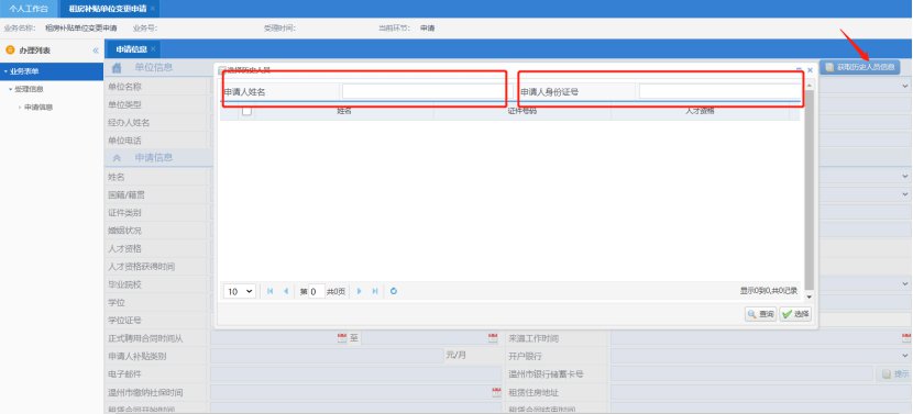 1. 登录后点击资格申请---资格变更申请---租房补贴单位变更申请(购房补贴单位变更申请),可以从历史人员中选择需要变更的人才(输入正确的姓名、身份证),即可获取历史申请记录。接着上传附件提交到初审环节,完成变更申请。