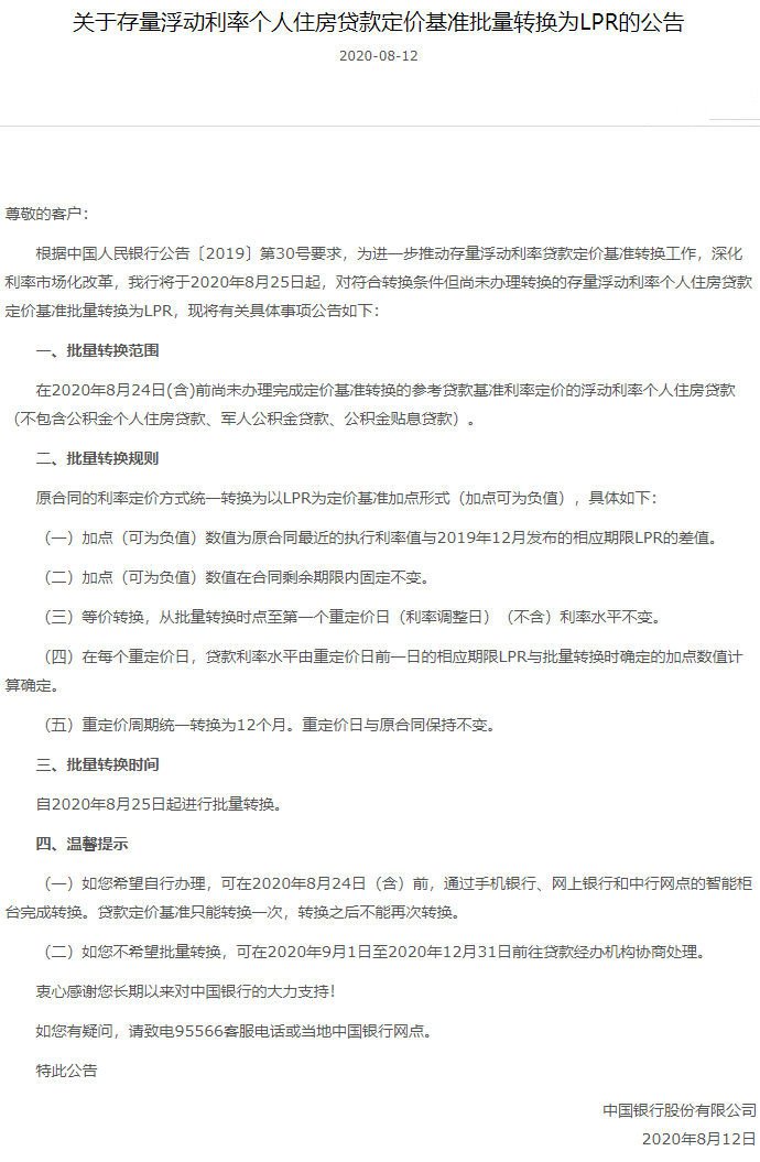 此前7月20日,交通银行已经发布公告,将于2020年8月21日对尚未转换为贷款市场报价利率(LPR)或固定利率的存量浮动利率房贷,统一调整为LPR浮动利率加减点方式。