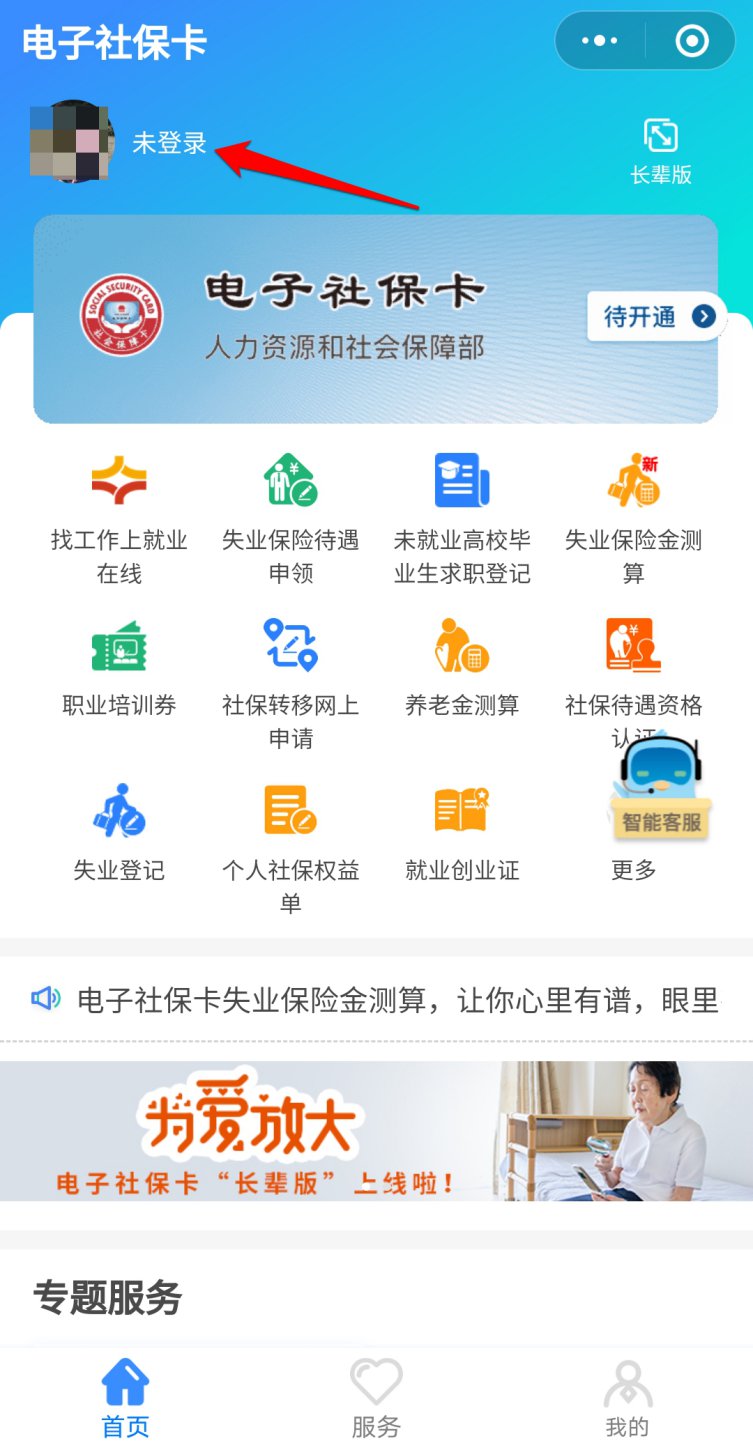 进入“电子社保卡”界面后,如显示“未登陆”的,点击下图红色箭头所指处进行登陆,如未领取电子社保卡的,按照提示领取。