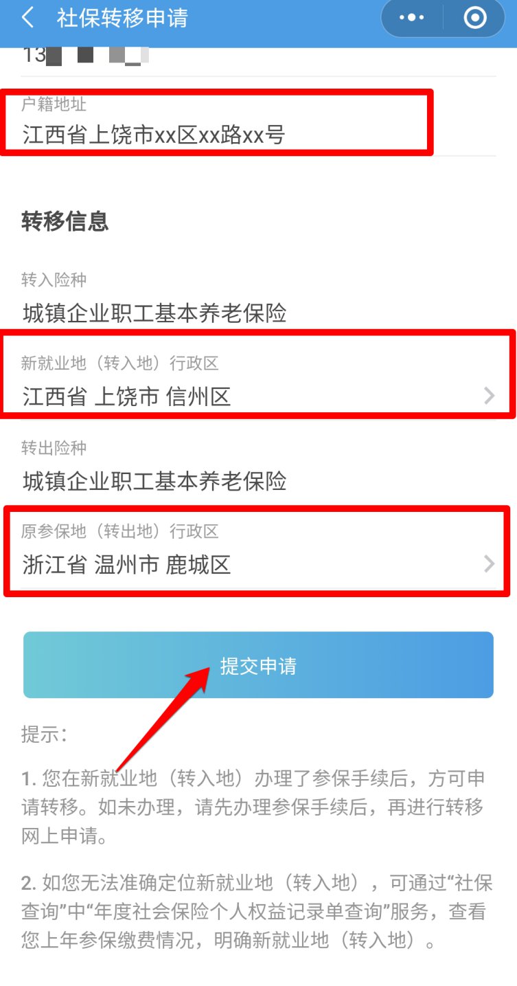 输入户籍地址,并分别选择转入地和转出地,然后点击“提交申请”,完成职工养老保险转移接续申请。