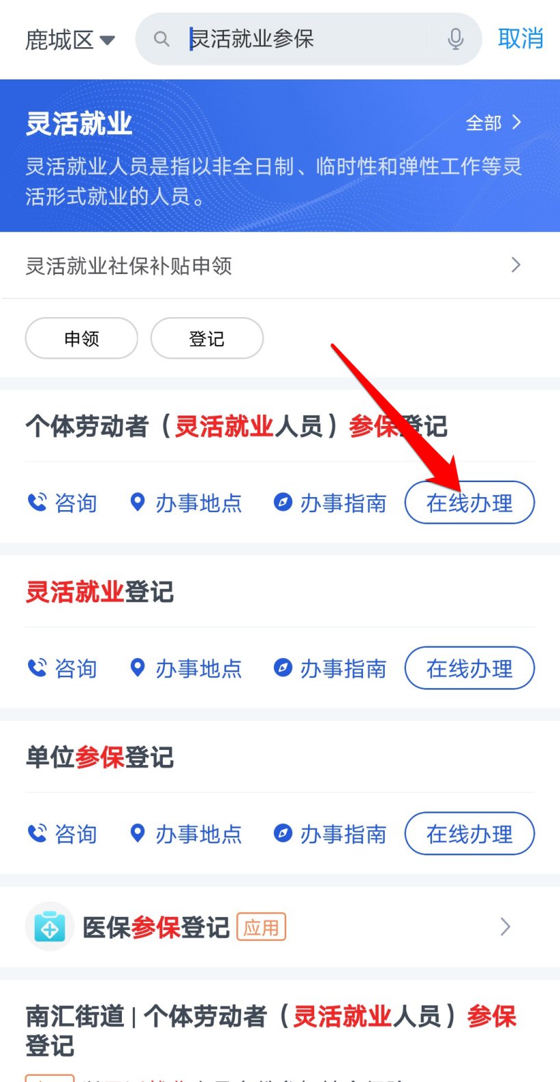 2、需要办理以灵活就业人员身份参加职工基本养老保险的个人,打开“浙里办”APP,搜索“灵活就业参保”,点击下图红色箭头处所示“在线办理”,进入“个体劳动者(灵活就业人员)参保登记”事项。