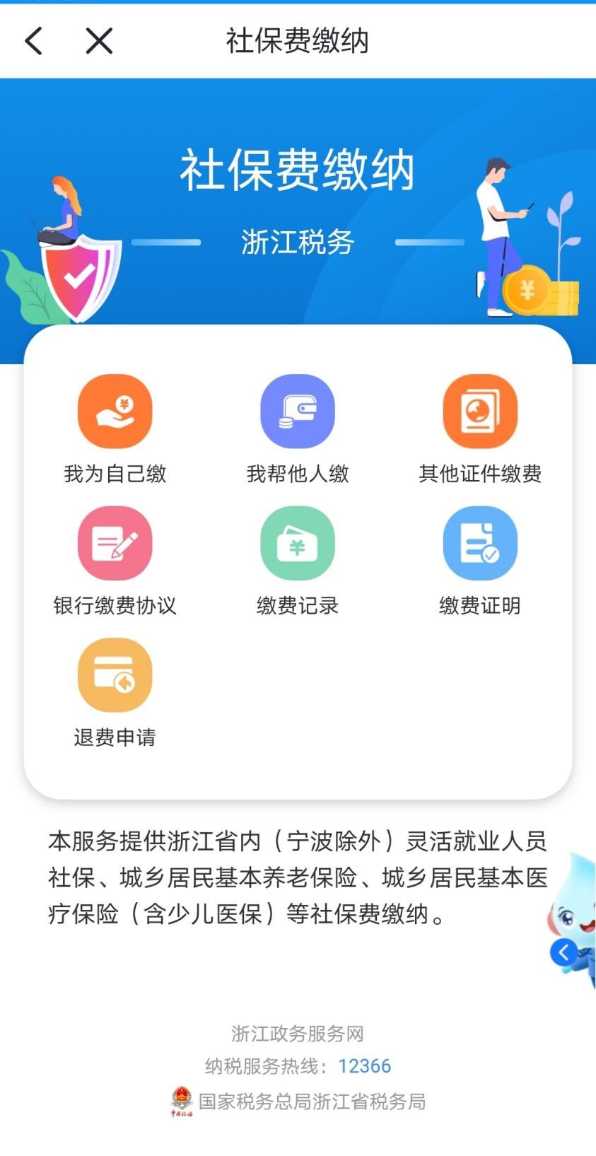 4、以灵活就业人员身份参加职工基本养老保险的个人,可以在办理参保次月(次月缴本月费用)开始,在浙里办直接搜索“社保费缴费”,通过下图所示红色圈中处,进入社浙江税务社保费缴纳界面,可以为自己或替他人缴纳社保费。